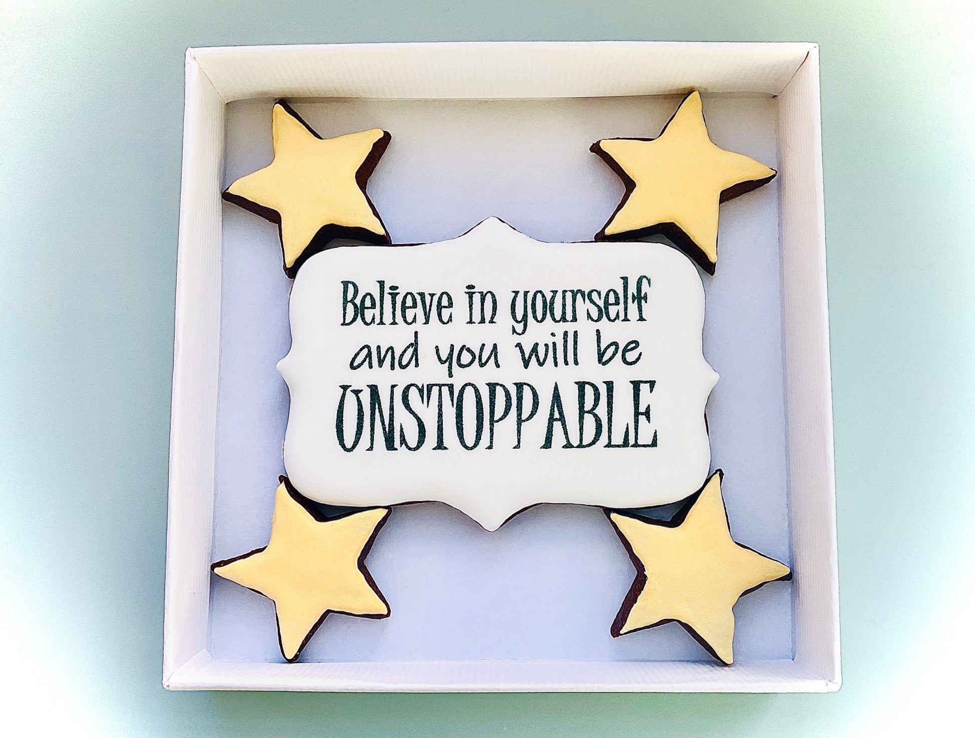 Perfect for gifts, celebrations, corporate events, or moments of encouragement, each ‘Quotivational’ biscuit is hand-iced and printed with food-safe edible ink and presented in a branded box accompanied by four small star-shaped biscuits.
